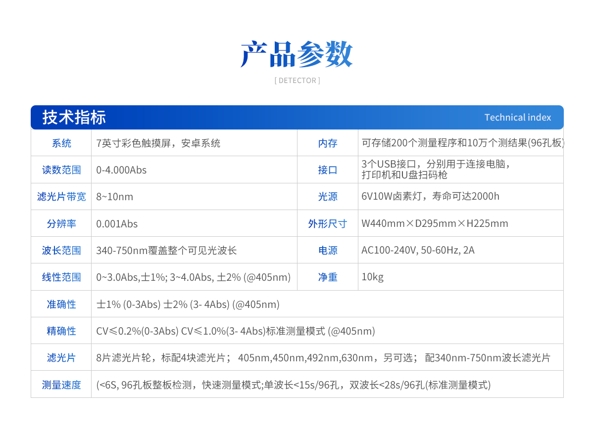 | 1. 高清觸摸屏: 顯示使用7英寸彩色觸摸屏,分辨率為1280*800像素。 | 2.內(nèi)置軟件: 內(nèi)置軟件可提供儀器的控制和數(shù)據(jù)分析,可直接外接U盤。 | 3. 光源壽命長(zhǎng): 光源采用6V10W鹵素?zé)?,壽命可達(dá)2000h。 | 4. 讀板快速: 采用單波長(zhǎng),雙波長(zhǎng)檢測(cè)讀板快速。 | 5. 振板功能: 根據(jù)使用配置了振板功能,可根據(jù)使用設(shè)置振板時(shí)間和速度。 | 6. 操作系統(tǒng): 配備自主研發(fā)的安卓操作系統(tǒng)可單機(jī)獨(dú)立使用,同時(shí)配置多種數(shù)據(jù) 輸出接口,方便不同的數(shù) 據(jù)傳輸和處理。 | 7. 可視化布板: 并采用可視化布板方式輸出測(cè)試結(jié)果。 | 8. 設(shè)置吸光度范圍:0~4.000Abs,滿足不同測(cè)量要求,并配備了8組濾光片輪,標(biāo)配4組濾光片,根據(jù)使用 可選配340 nm~750nm波長(zhǎng)的濾光片組合使用。設(shè)計(jì)合理無(wú)需打 開機(jī)蓋就可更換光源和濾光片。 | 9.檢測(cè)數(shù)據(jù):使用自動(dòng)校準(zhǔn)、定位系統(tǒng)算法使檢測(cè)數(shù)據(jù)更精準(zhǔn)、可靠。 | 10. 配置對(duì)光路: 配置對(duì)光路,機(jī)械運(yùn)動(dòng)等進(jìn)行自檢和診斷校對(duì)功能。 |