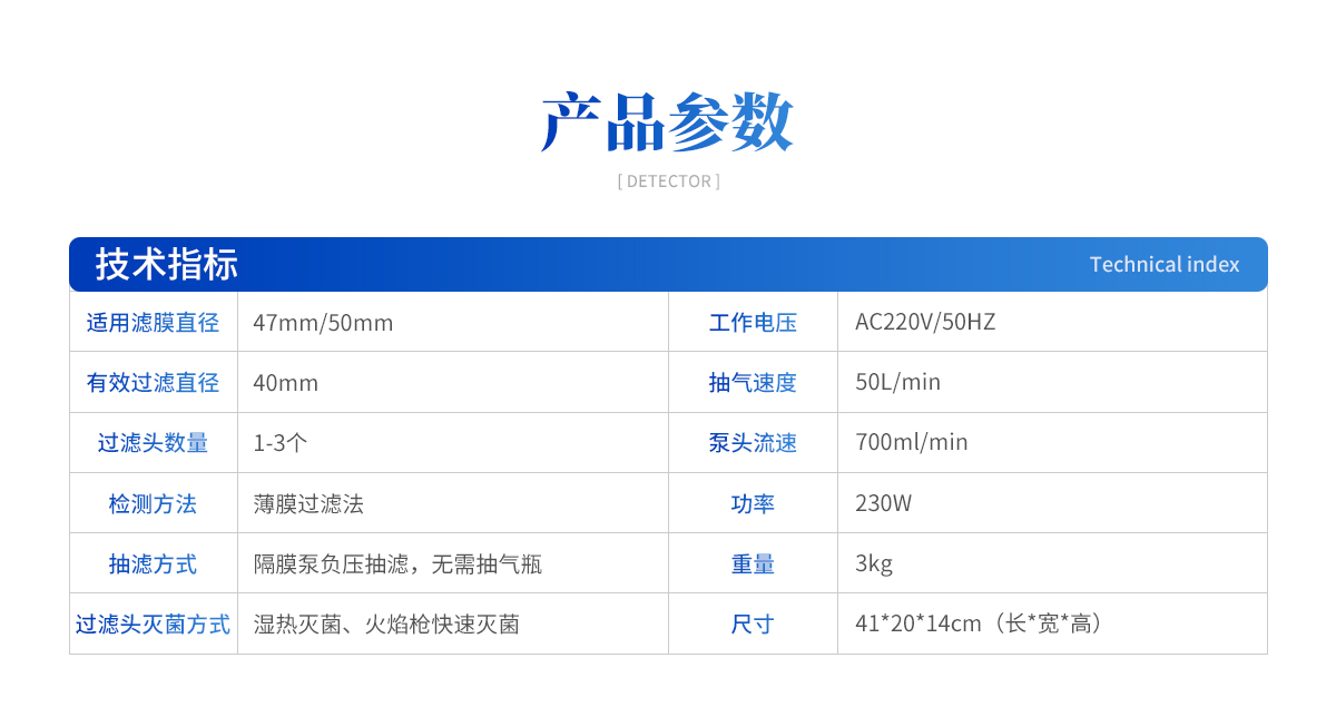 | 1、適用濾膜直徑:47mm/50mm 2、有效過濾直徑:40mm 3、過濾頭數(shù)量:1-3個; 4、檢測方法:薄膜過濾法 5、抽濾方式:隔膜泵負壓抽濾,無需抽氣瓶 6、過濾頭滅菌方式:濕熱滅菌、火焰槍快速滅菌 7、尺寸:41*20*14cm(長*寬*高) 8、重量:3kg 9、功率:230W 10、工作電壓:AC220V/50HZ 11、噪音小于30dB 12、物理按鈕開關(guān) 13、可選擇單頭、三頭結(jié)構(gòu),選型豐富 14、抽氣速度:50L/min 15、泵頭流速:700ml/min |