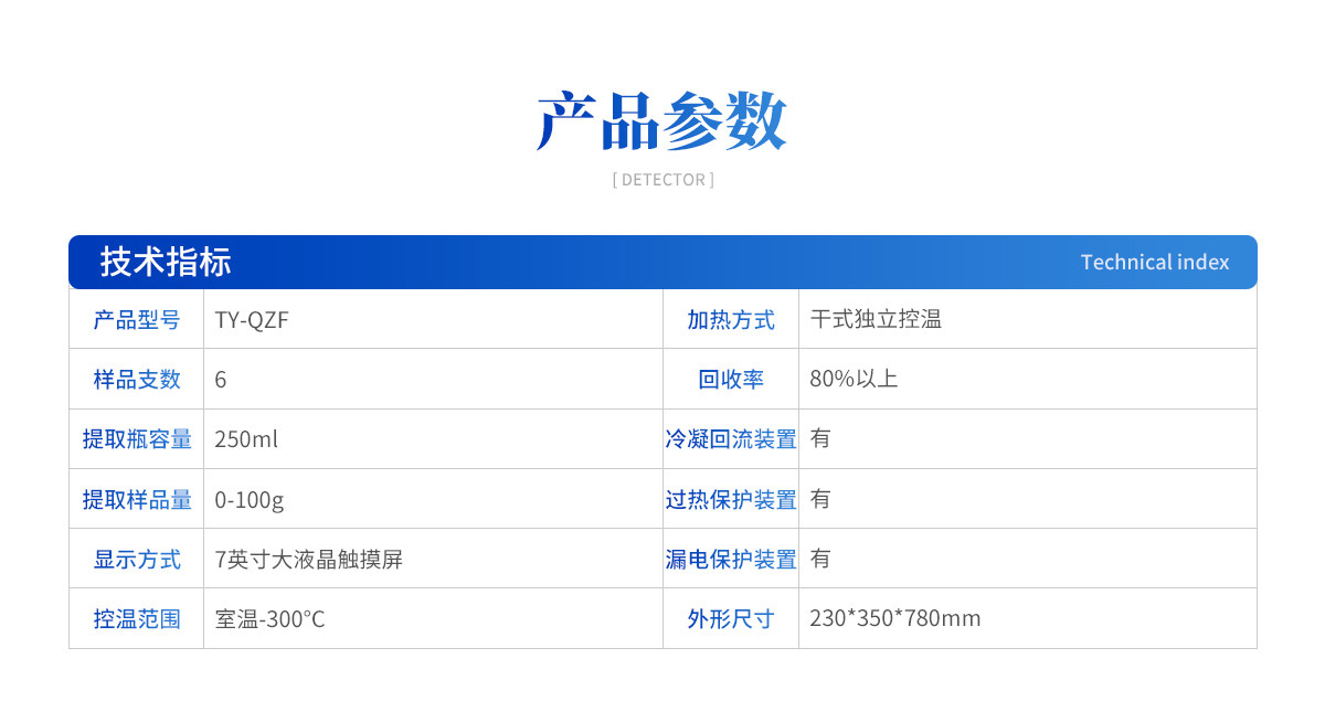 | 產(chǎn)品型號(hào):TY-QZF 樣品支數(shù):6 提取瓶容量:250ml 提取樣品量:0-100g 顯示方式:7英寸大液晶觸摸屏 控溫范圍:室溫-300°C 加熱方式:干式獨(dú)立控溫 回收率:80%以上 冷凝回流裝置:有 過(guò)熱保護(hù)裝置:有 漏電保護(hù)裝置:有 外形尺寸mm:230*350*780 |