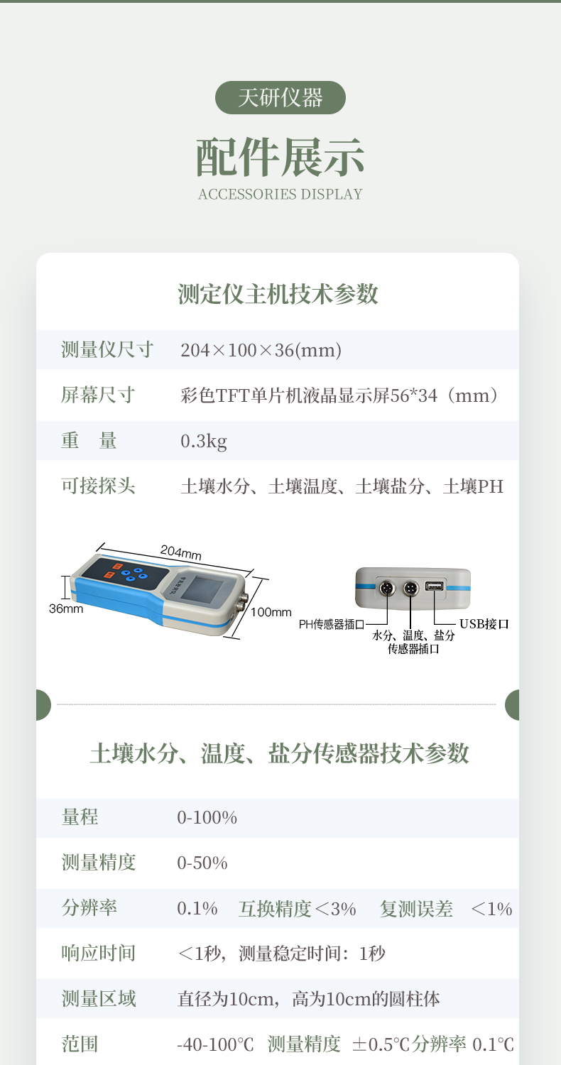 產(chǎn)品簡介: 土壤水分測定儀采用FDR頻域反射原理,快速準(zhǔn)確測量土壤中含水量,可對(duì)多處樣地、不同土壤深度的水分含量進(jìn)行快速檢測和長期連續(xù)監(jiān)測。廣泛應(yīng)用于土壤墑情檢測、旱作節(jié)水灌溉、精細(xì)農(nóng)業(yè)、林業(yè)、地質(zhì)勘探、植物培育等領(lǐng)域。 功能介紹: 儀器可加配